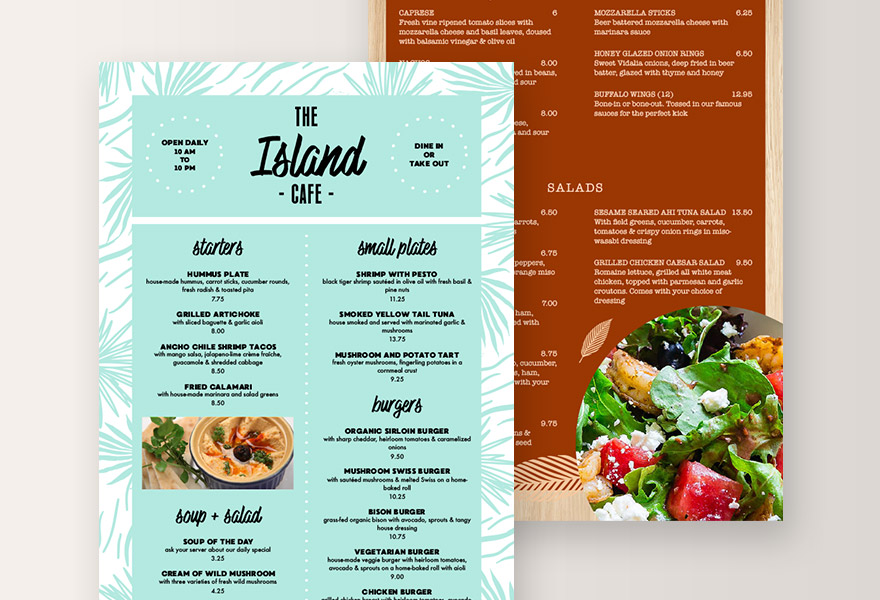 Try our Seasonal menu templates to ensure that your customers look forward to spending their seasonal events with you. Easily customize the menu items on the template and add your special color or graphical touches. You'll have a professionally-designed look in no time.