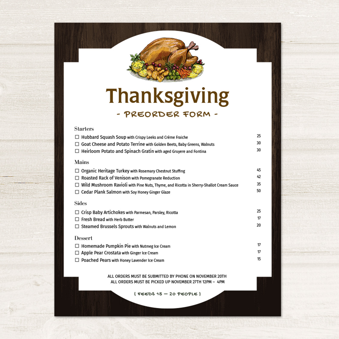 Make this Thanksgiving one to remember with Autumnal menu designs, festive flyers, and Thanksgiving meal preorder forms.